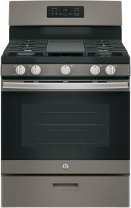 GE® 30" Slate Free Standing Gas Range with 5.0 cu. ft. total capacity, edge to edge cooktop and center oval burnerRead More