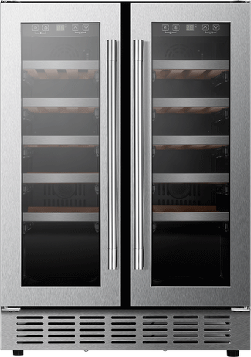 Vitara 24" Stainless Steel Wine Cooler has Built-Under or Free Standing installation, Temperature range 39°F-68°F for left & right zone, Electronic Touch control with white LED Readout, and Low-E, Anti-UV resistant two layer Glass Door.Read More